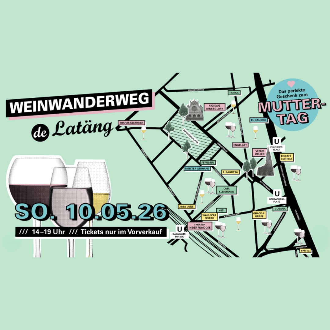 Auch dieses Jahr findet am Muttertag, So. 10. Mai von 14-19 Uhr im Kwartier Latäng wieder der "Weinwanderweg de Latäng" statt! Mit dabei sind 18 tolle Gastronomen – jeweils mit eigener Weinauswahl. Tickets sind nur online bei “Rausgegangen” im VVK erhältlich! Bring bitte – auch aus nachhaltigen Gründen – Dein eigenes Weinglas mit!